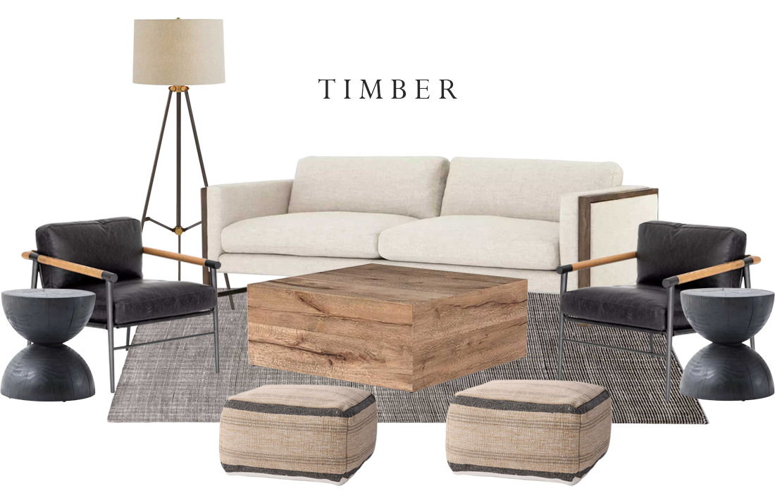 Timber Furniture Vignette(1) Thames Sofa (2) Adalynn Pouf (2) Rowen Chairs (1) Covell Table (2) Black Pine Accent Tables (1) Miles Floor Lamp (1) Jackson Area Rug 8’x10′ *All Furniture Vignettes are Customizable!*