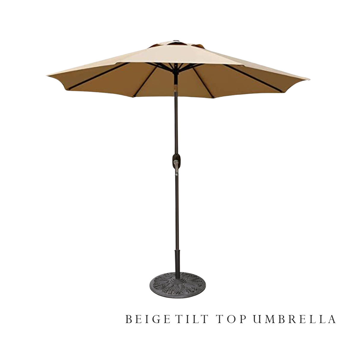 Veranda Outdoor Vignette: Beige Tilt Top Umbrella w/ Base |